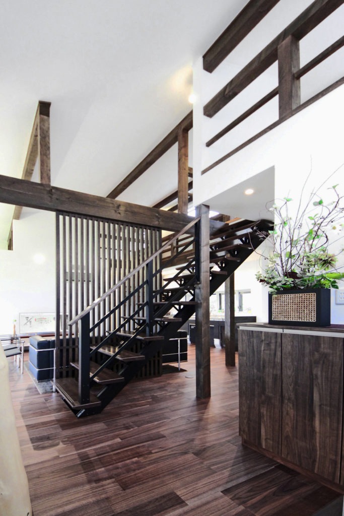 ロフトに続く階段は、スケルトン階段を採用。踏み板はダークブラウン、手すりはブラックで統一し、落ち着いた雰囲気を演出しています。このスケルトン階段の効果で、自然光が奥の部屋まで明るく届きます。